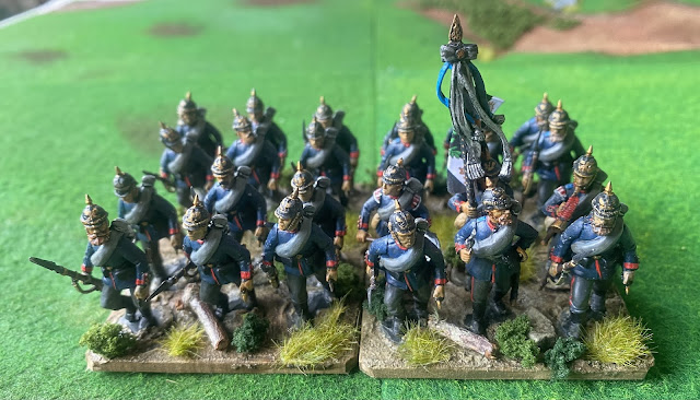 I have done this battalion as a firing line and represents the Fusilier Battalion, 15th (6th Westphalian)   Infantry Regiment from 13th Division (the only significant difference in the uniform on these models is that the belts are black instead of white for the musketeer battalions). Being an older regiment than the two battalions I had done earlier, I have given them the earlier 1860 Picklehaube (it has a brass cross under the spike instead of a  disc and a brass band running down the back of the helmet) and they carry the earlier standard.