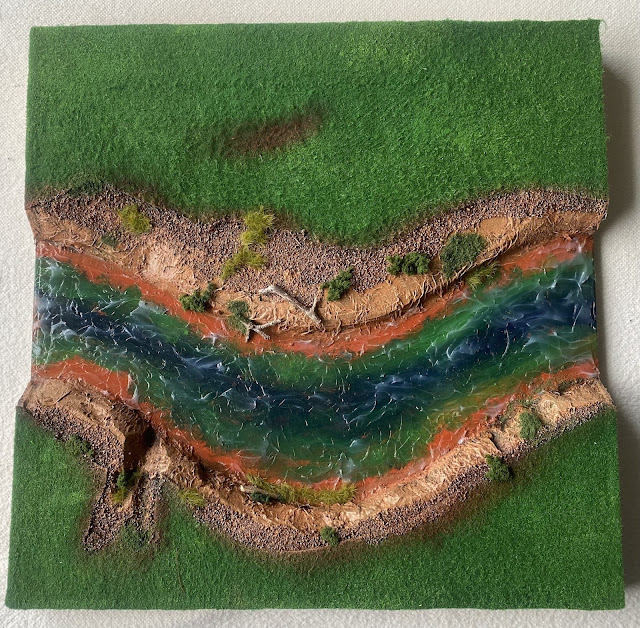 The second piece is a river section. One of the limitations of using a 300mm square tile with a central entry/exit point is that it is difficult to avoid a dead straight river. So in an effort to soften that look, this tile is one of two that will have a deep bend along the length. While it involved a bit more effort than the first piece, it too was a relative simple build.